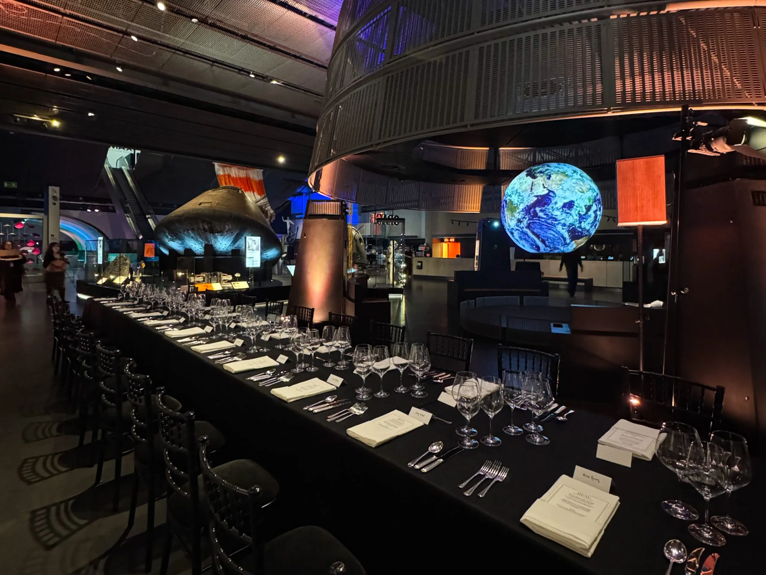 One of the standout moments of the month was a dinner in the newly opened Gallery ‘Space’ at the Science Museum. Guests dined surrounded by extraordinary artefacts, including Helen Sharman’s Sokol spacesuit (the very suit worn by the first Briton in space)and a three billion year old moon sample (brought back to Earth by Apollo 15). The menu was equally inspiring, beginning with chalk stream trout mi-cuit, followed by a sous-vide fillet of Surrey beef, and finishing with Space, a bespoke pudding encased in a shimmering gold and purple chocolate sphere. Once placed on the table, our servers poured a Valrhona Macae chocolate sauce over the sphere, melting away to reveal the delicious sour cherry semifreddo. Make sure to check out our reel to see how the event unfolded.